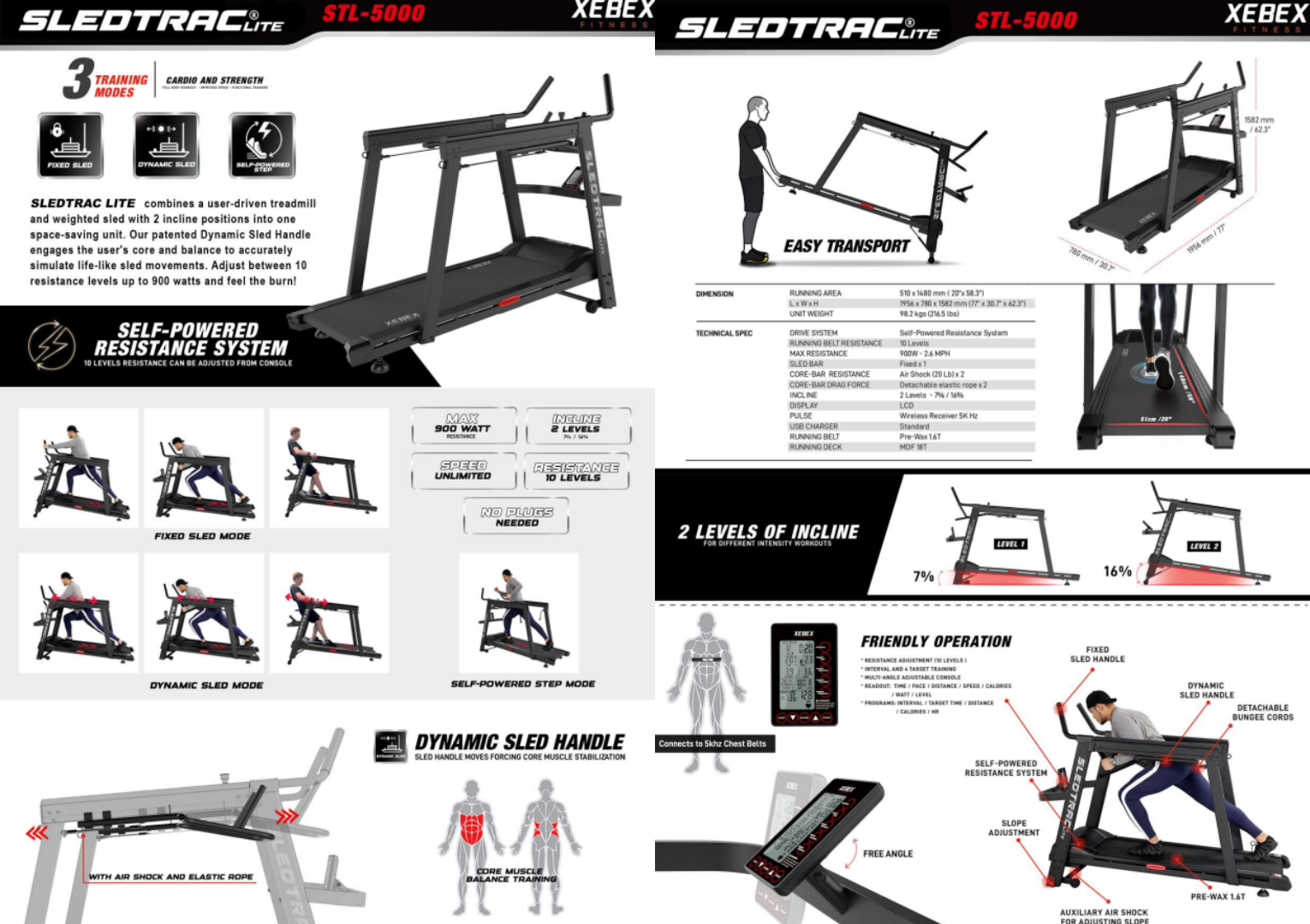 Videoposnetek predstavlja Xebex SledTrac Lite 5000 (STL-5000) – inovativno napravo, ki združuje treadmill na lasten pogon in utežene sani v eni kompaktni enoti. Opremljena je z dinamičnim ročajem, ki aktivira jedro in ravnotežje uporabnika ter simulira realistično gibanje sani. Naprava omogoča 10 stopenj upora do 900 W in 2 naklonski stopnji (7 % in 16 %), kar omogoča raznoliko in intenzivno vadbo